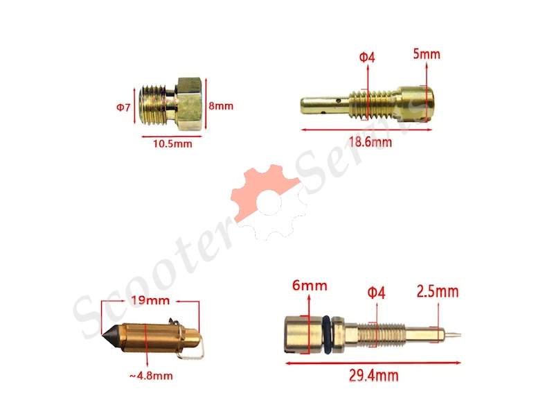 Головний жиклер: довжина 10.5 мм, діаметр різьби 7 мм, капелюшок 8 мм. Жиклер холостого ходу: загальна довжина 18.6 мм, діаметр 4 мм / 5 мм. Голчастий клапан (поплавка): довжина 19 мм, товщина ~4.8 мм. Гвинт регулювання суміші: загальна довжина 29.4 мм. Мембрана в зборі: вакуумна заслінка з дозуючою голкою. Комплектація: поплавок, мембрана, заслінка, голка, жиклери, прокладки, ущільнювальні кільця та пружини.